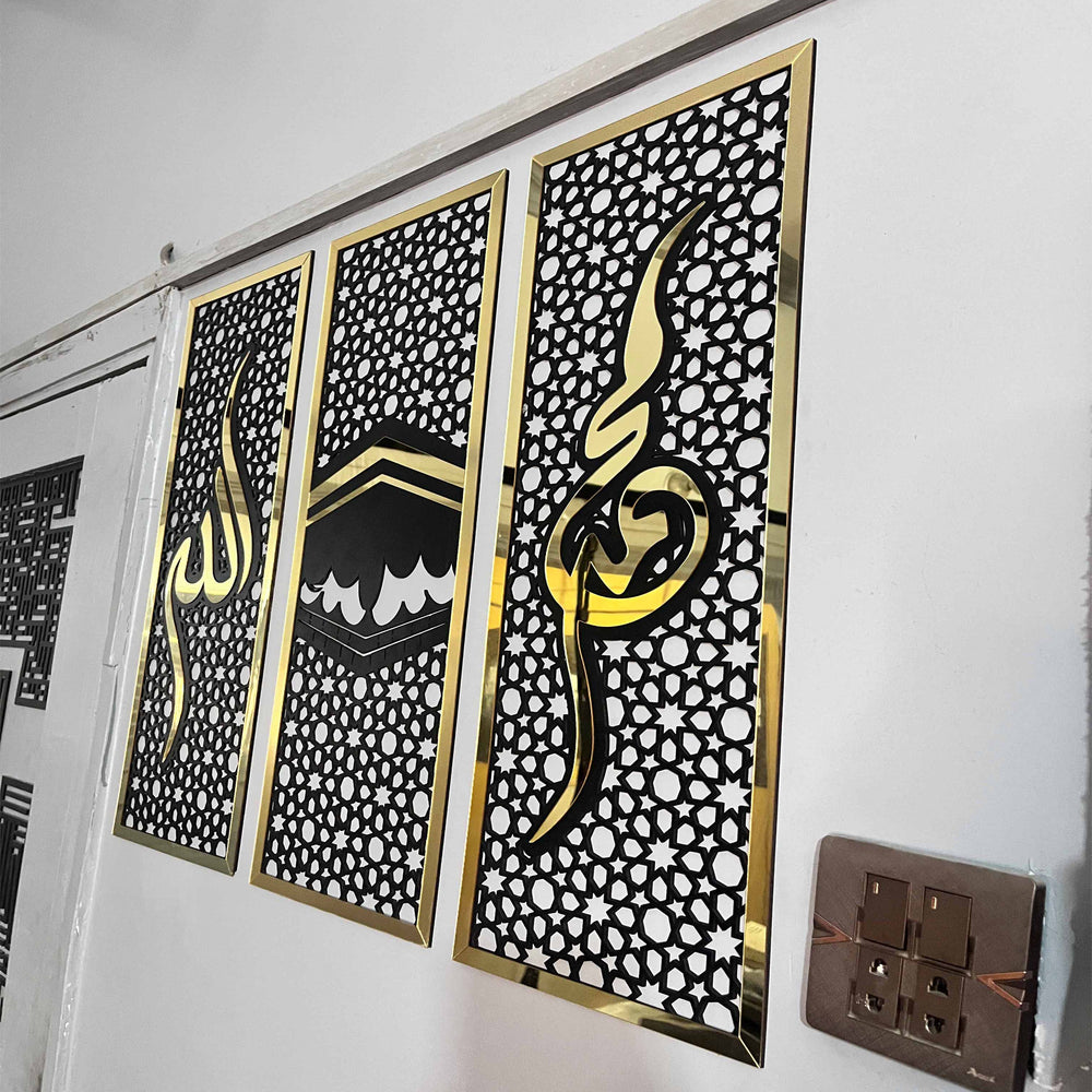 xBring spirituality and elegance to your space with this Set of 3 Islamic Calligraphy Wall Decor Frames featuring Allah, Muhammad (SAW), and the Kaaba. Crafted on high-quality wood, with beautiful Islamic calligraphy and modern wall art style, these frames are perfect for home, living room, prayer room, or office décor. A meaningful Islamic wall decoration and a thoughtful gift for loved ones.