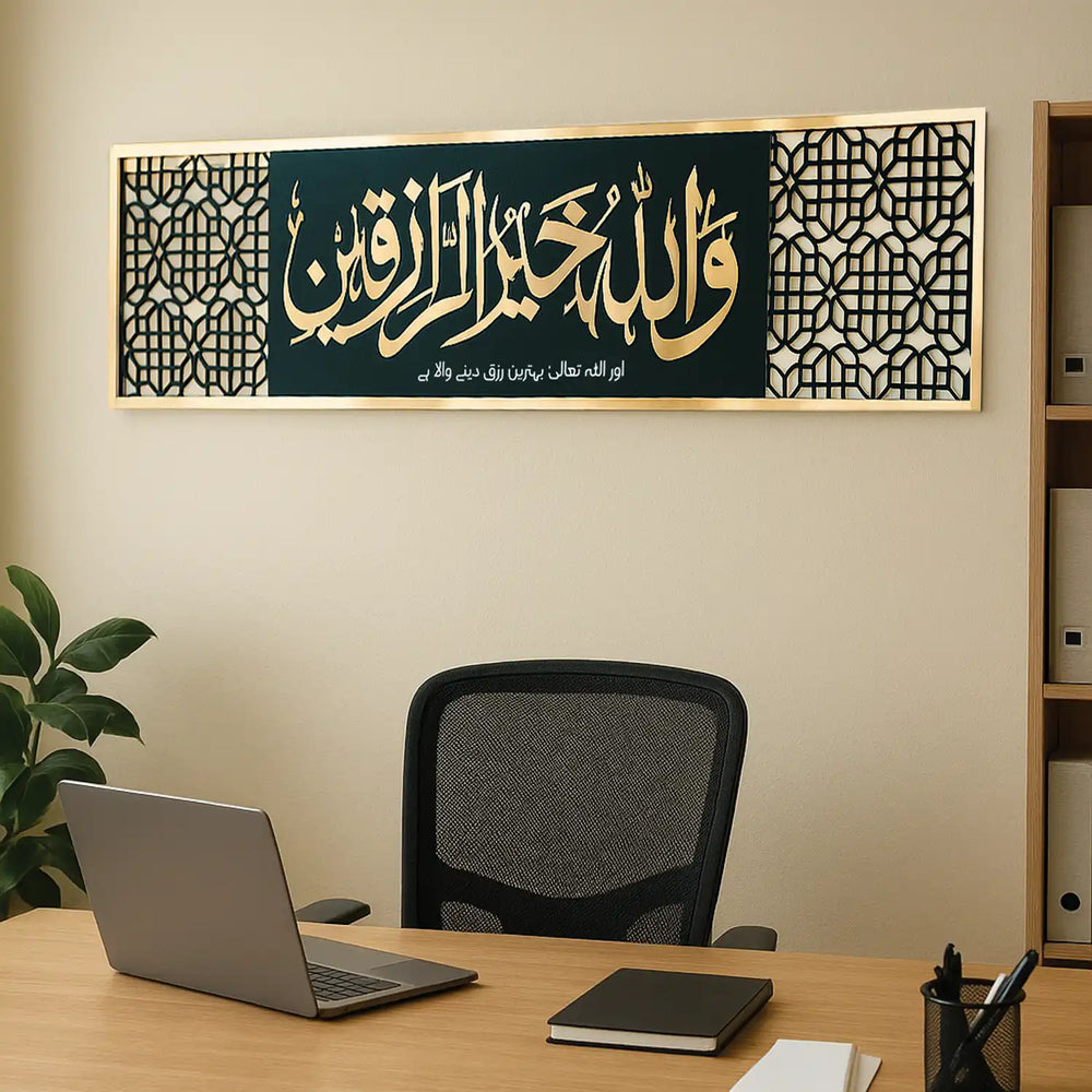 Walla-Hu-Khair ur-Raziqeen Wall Art – Islamic Calligraphy Wooden Wall Decor with Golden Acrylic